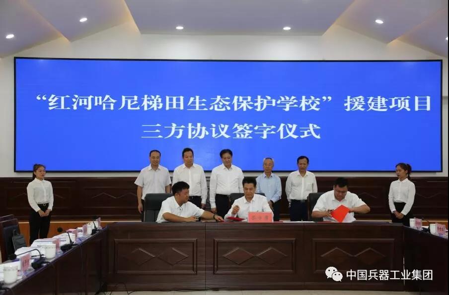 會(huì)上,兵器工業(yè)集團(tuán)、中國(guó)扶貧基金會(huì)和紅河縣簽署了“紅河哈尼梯田生態(tài)保護(hù)學(xué)校”援建項(xiàng)目三方協(xié)議。