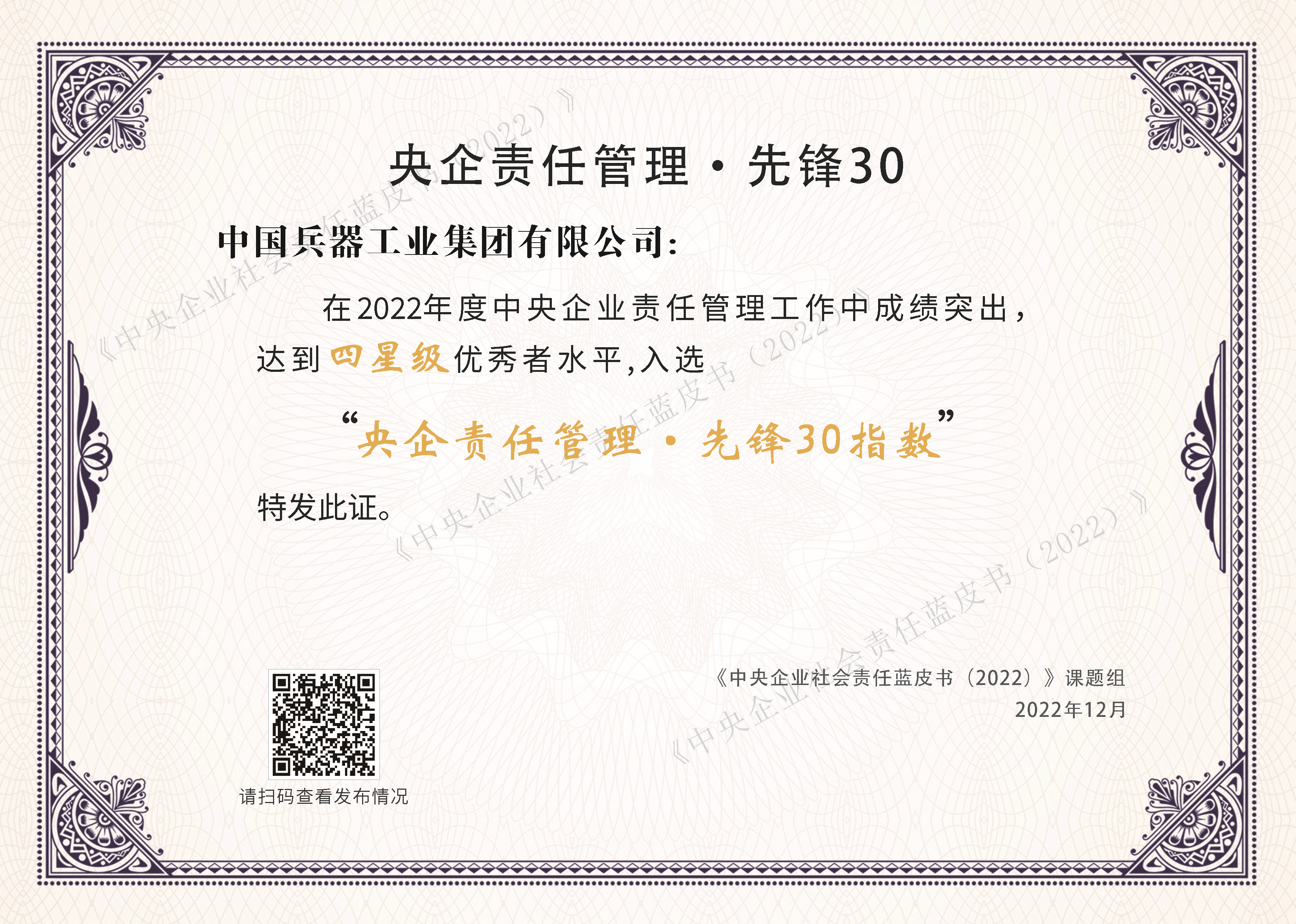 12月20日,由國務(wù)院國資委社會責(zé)任局主辦、中國社會責(zé)任百人論壇承辦的“新征程新責(zé)任——《中央企業(yè)社會責(zé)任藍(lán)皮書(2022)》《國資國企社會責(zé)任藍(lán)皮書(2022)》發(fā)布活動”在京召開,國務(wù)院國資委黨委委員、秘書長彭華崗出席并講話?!侗鞴I(yè)集團堅定不移推進綠色低碳發(fā)展》作為優(yōu)秀案例入選《中央企業(yè)社會責(zé)任藍(lán)皮書(2022)》,充分展示了兵器工業(yè)集團在綠色低碳發(fā)展方面的責(zé)任擔(dān)當(dāng)和履責(zé)成效。同時,兵器工業(yè)集團責(zé)任管理達(dá)到四星級優(yōu)秀者水平,成功入選“央企責(zé)任管理·先鋒30指數(shù)”?!把肫筘?zé)任管理·先鋒30指數(shù)”是對中央企業(yè)在責(zé)任組織、責(zé)任融合、責(zé)任溝通等方面的建設(shè)情況進行綜合評價的專項指數(shù),為今年首次發(fā)布。