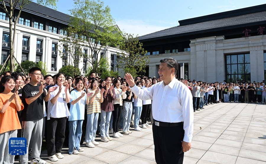 6月8日,中共中央總書(shū)記、國(guó)家主席、中央軍委主席習(xí)近平在四川考察。這是8日下午,習(xí)近平在宜賓學(xué)院考察時(shí),向師生們揮手致意。新華社記者 謝環(huán)馳 攝