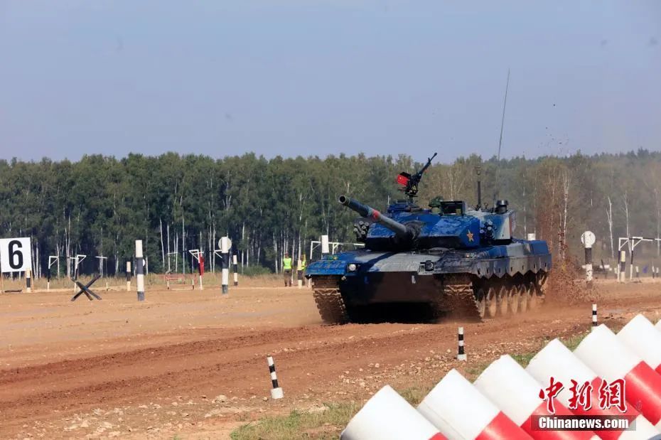 比賽采用錯時發(fā)車,藍色涂裝的中國戰(zhàn)車排在第4賽道出場。比賽開始后,中國參賽隊3名車組成員迅速登上坦克,隨著發(fā)動機的轟鳴,坦克在賽道上急速馳騁,迅速進入火炮射擊陣位。發(fā)現(xiàn)目標后,隨即調轉火炮迅速鎖定目標,果斷擊發(fā)命中目標。